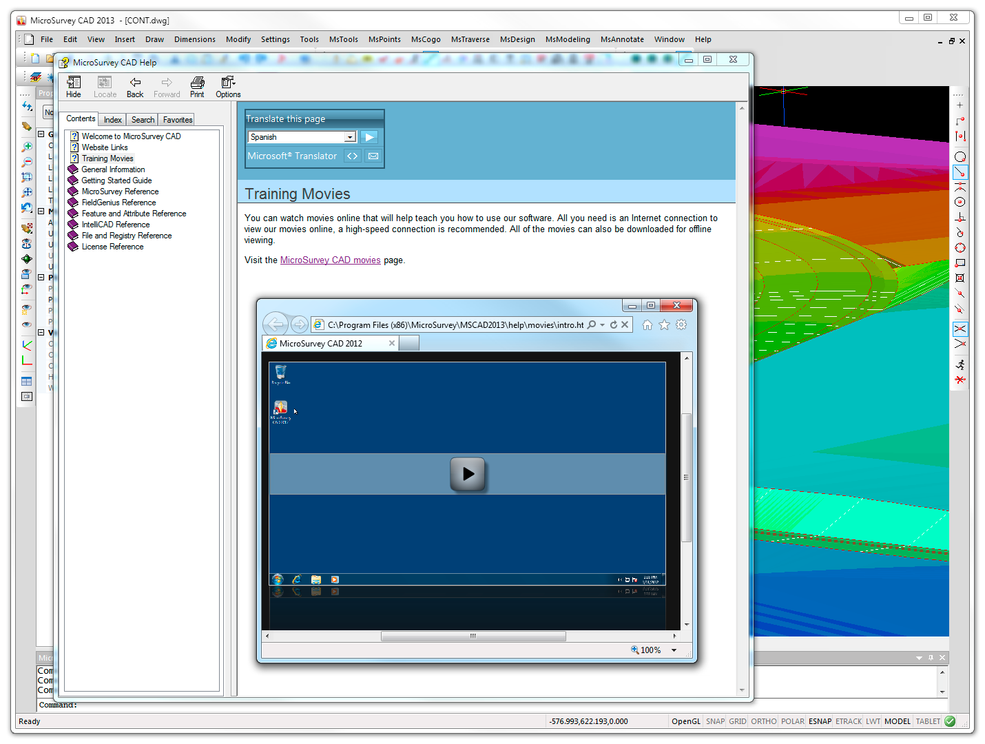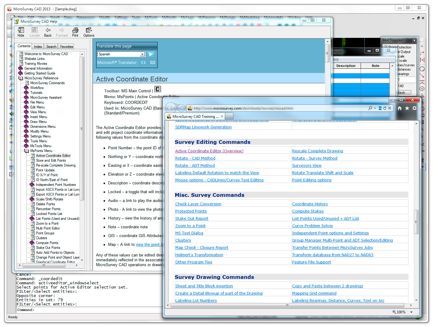 Over twelve hours of training movies (more than 170) are included. To quote Joe Bell from Professional Surveyor Magazine, “If you forget how to do something, you do not have to run to the office guru or spend hours going through the manual trying to find out how to do what you want to do. You just go to the movies-the ones in the Help files, that is…you have access to 123 neatly arranged movies that tell and show you exactly what you have to do”. Also included is the most modern help system available – with a fully indexed, linked help file that exactly models the layout of the pulldown menus. It could not be easier to find items than to see them exactly ordered the same as the menus. The movies play right inside the help system. It is the easiest method of learning software. A complete description of all the CAD drawing and editing commands is included in the help system. Many commands in both the surveying and drafting sections have direct movie links. Documentation is also provided for one of the extra bonus values in using MicroSurvey CAD – Lisp programming! Lisp is an easy language to master, and with lisp you have even more control over the CAD engine. MicroSurvey provides a lisp interface to the coordinate database, so you can write simple routines do import or export in your own desired format, or perform custom calculations between coordinate points.