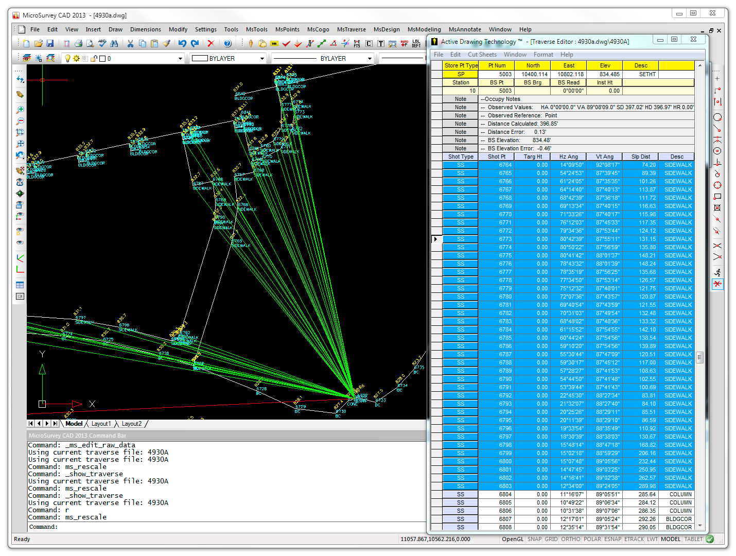Active Coordinate Editor Dynamically view and edit coordinate data with changes reflected immediately in both the coordinate editor window and in the drawing window. MicroSurvey CAD operates intuitively: selecting a point in the drawing will open the editor and highlight that coordinate in the editor automatically. Alternatively, selecting a coordinate in the editor will zoom to that point in the drawing. Active Traverse Editor Verifying and editing your raw data is now much faster and allows for painless correction. Traverse data is represented in a smart, spreadsheet-like editor that has incredible drag and drop capabilities. The Active Traverse Editor allows you to not only work with your raw data at any point in the traverse quickly, but it also allows customization of the views available and opens multiple traverse data sets simultaneously. Errors in your traverse data are amazingly easy to spot and fix. Active Batch COGO Batch COGO is a system for data entry and calculation that allows you to browse an entire COGO entry history, quickly identify errors and easily make changes. At any point, COGO entries can be edited and reprocessed with the correction immediately reflected in the drawing. What’s more, the interface is built with smart tags for data types like Traverse, Bearing-bearing intersection, Distance-distance intersection and more. MicroSurvey’s Active Batch COGO is like nothing else on the market! Advanced Features Inside the active coordinate editor window you can choose to display geodetic positions, ellipsoid and orthometric heights, convergence angles and combined scale factors for your points.