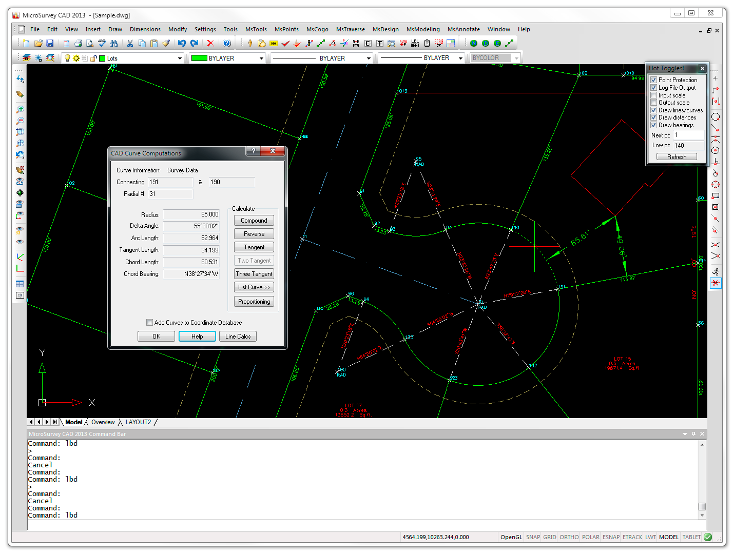 Record all of your COGO entries with Batch and replay as desired. MicroSurvey CAD includes a powerful set of COGO functions. Our new Batch COGO capability is unmatched. As part of Active Drawing Technology, it allows you to build complex COGO calculations in a spreadsheet and re-run them as necessary. MicroSurvey CAD also includes command line COGO that you can use at any time by simply typing “COGO” at the prompt. You immediately enter a familiar style of entry that prompts for point numbers, bearings, distances, and solve points. Intersections are computed by leaving unknowns blank, and letting the program automatically determine what type of intersection you would like to compute. Bearings, distances, point numbers can all be picked off the screen by selecting point labels or lines. COGO commands are also available in a more graphical format. If you select a line or arc on the screen with no command running, you can immediately calculate new points. MicroSurvey CAD also allows you to compute without storing point numbers. The lines and arcs that you create can be instantly coordinated and numbered at a later time. Helmerts Transformation. With the Helmert’s Transformation, you are able to rotate, shift and scale up to thousands of points based upon a best fit solution using 2 to 500 pairs of common coordinate points, all with the execution of a single command! When more than two points are common in each system, redundancy exists and a Least Squares method is used to determine the optimum (best-fit) transformation parameters. Coordinate Transformations. Use the coordinate transformation function to easily transform your data from one system to another. UTM, 3TM, SPC (NAD27, NAD83, HARN) and hundreds of others are supported. Other Tools. A Proportioning function makes it easy to proportion distances along arcs or curves, to create equal line divisions and divisions based on ratios like dividing a line into 2 segments 1 segment at 2/3 of the overall distance and the other at 1/3. Radial Inversing can be used to create radial field ties quickly and effectively. List the ties in a line table with the click of a button.