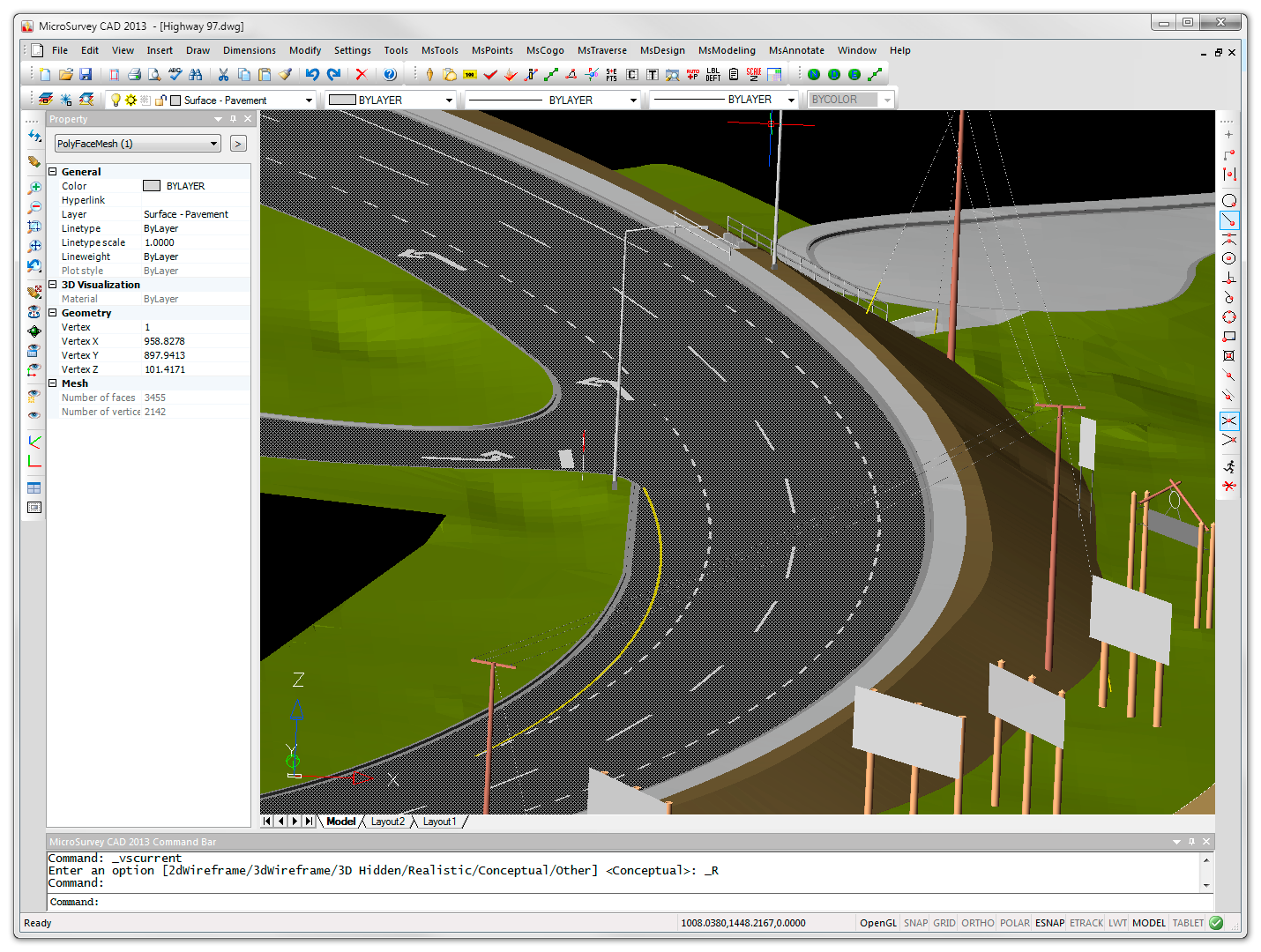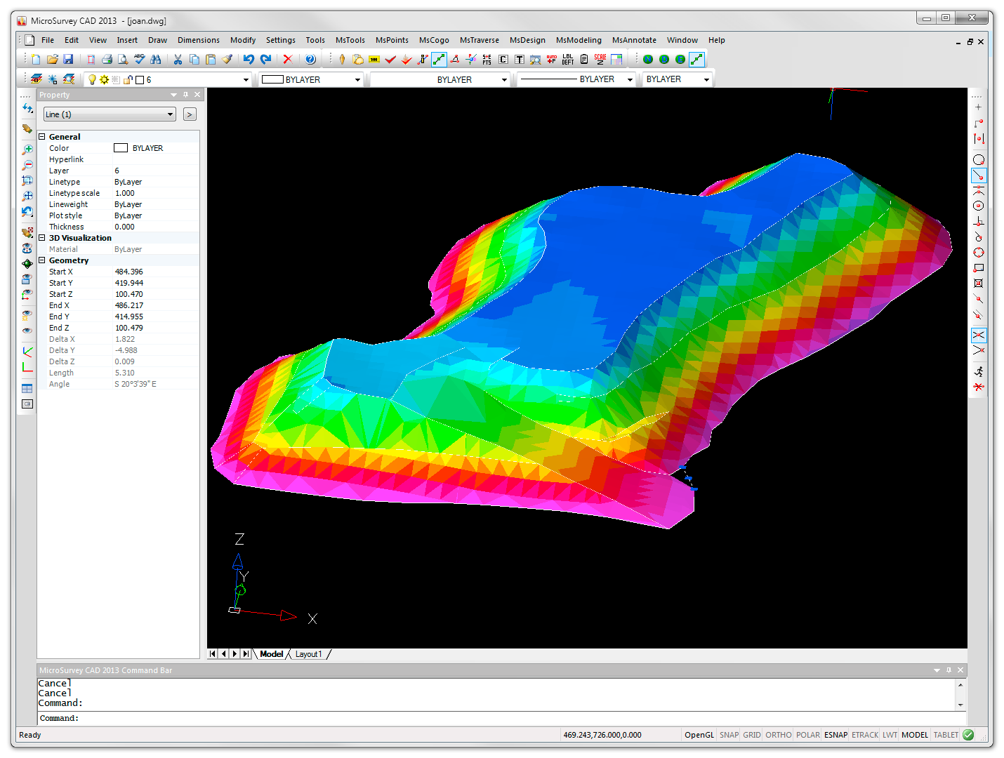 As part of a complete package, MicroSurvey CAD creates surface models at lightning speed. With very fast modeling engines, you can manipulate surfaces by adding or removing points, work with breaklines, and create boundaries. We stopped testing triangulation speed when it broke through the 100,000 points per second level. Volumes are computed fast and easy between multiple surfaces, or between a surface and a specific elevation. Multiple area volumes can be computed simultaneously by defining boundaries. These act like a “cookie cutter” to slice vertically through surfaces to get specific volumes. Visualization in MicroSurvey CAD is unmatched with fast 3D rendered views of TINS, Grids, and Triangulated Grids (a more accurate method of representing a surface). Cross sections or Profiles are just a click a way.